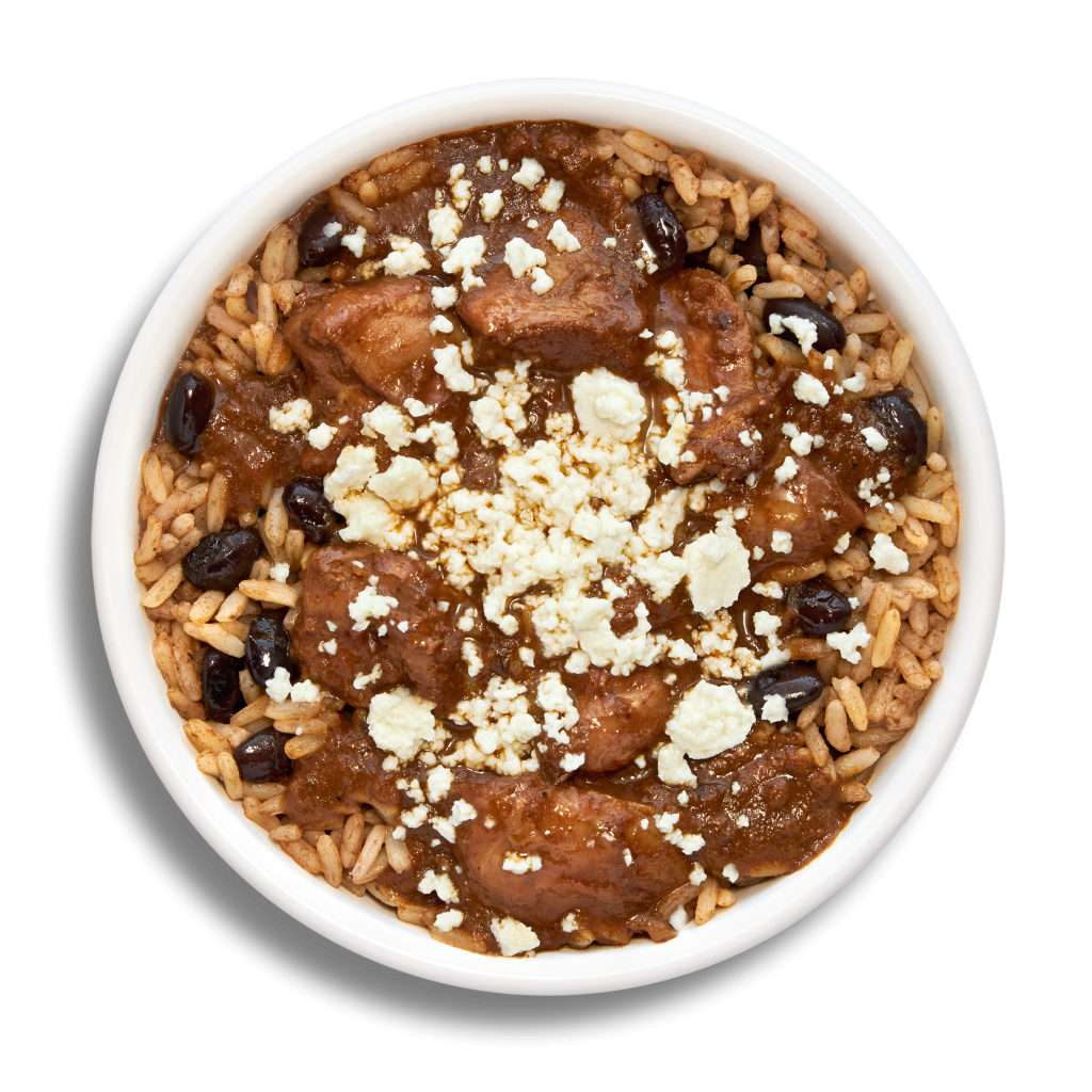 Our Chicken Mole Burrito Bowl features tender dark meat chicken simmered in traditional mole sauce, served over rice and beans, and finished with a sprinkle of queso fresco. Every bite delivers deep, rich, and authentic flavor.